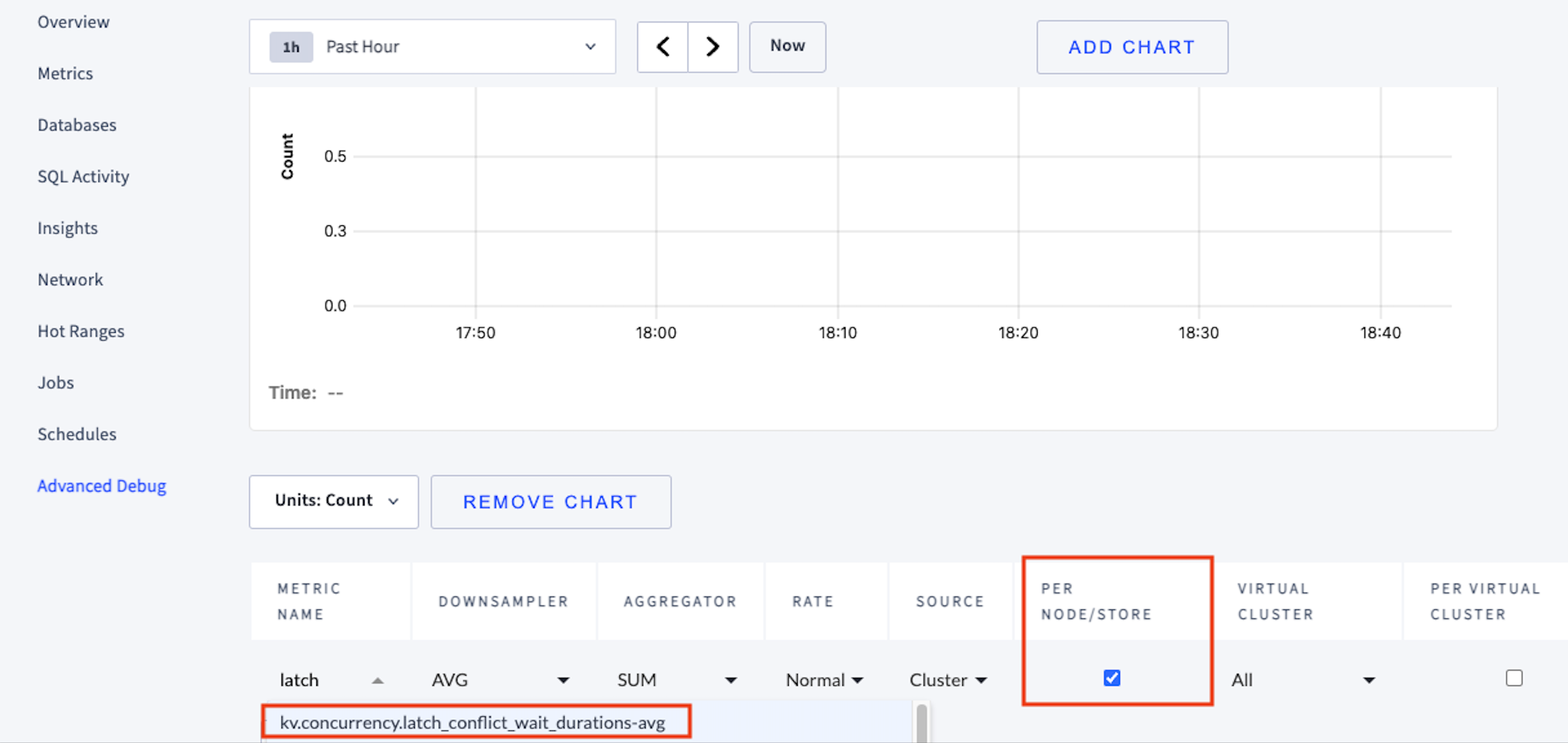 2. Create a custom chart to monitor the kv.concurrency.latch_conflict_wait_durations-avg metric, which tracks time spent on latch acquisition waiting for conflicts with other latches. For example, a sequence that writes to the same row must wait to acquire the latch.